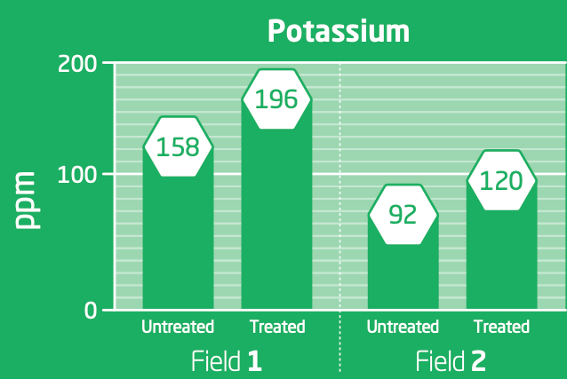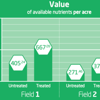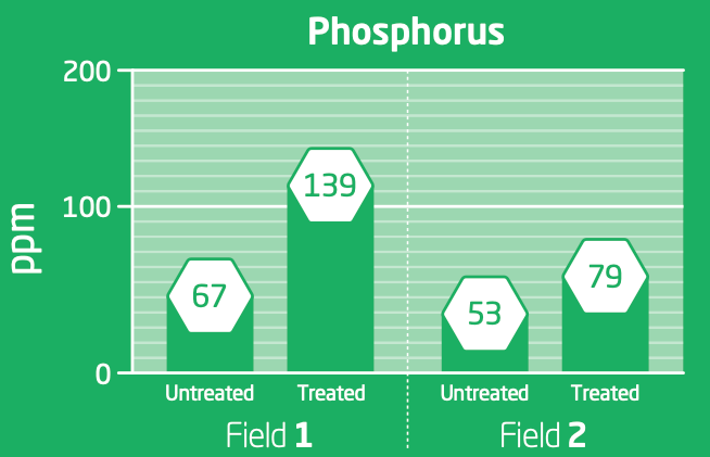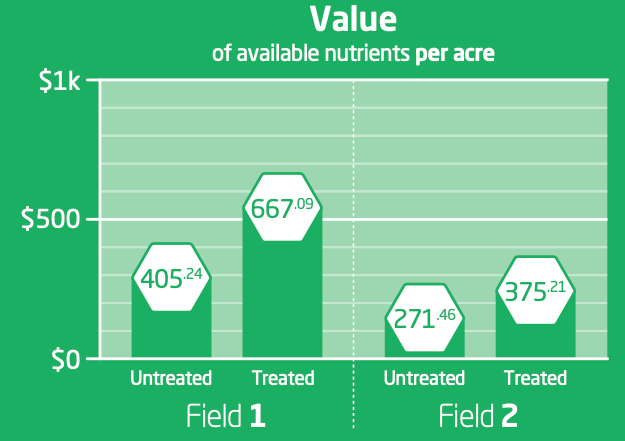An independent research firm conducted tests on two fields. The soil analysis showed considerable increases in the amount of two key nutrients, phosphorus and potassium. A monetary value was then calculated, resulting in a nutrient value-per-acre increase of over 64%