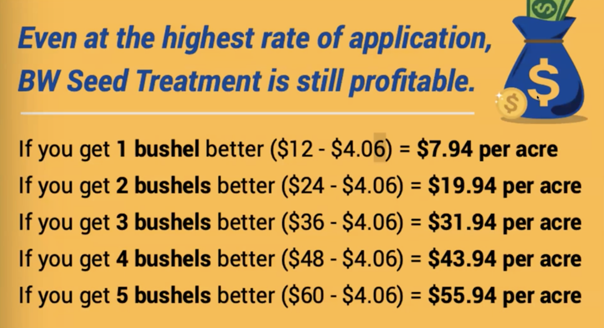 We’re proud to share that even at the highest rate of application, BW Seed Treatment provides a positive ROI. Check out this image for a full breakdown of ROI.