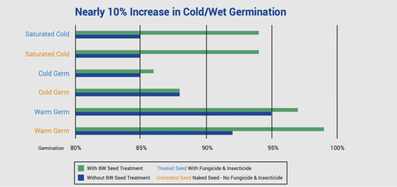 In an independent trial by the Indiana Crop Improvement Association, BW Seed Treatment proved to cause a nearly 10% increase in germination in cold, wet conditions, along with noticeable increases in warm germination.
